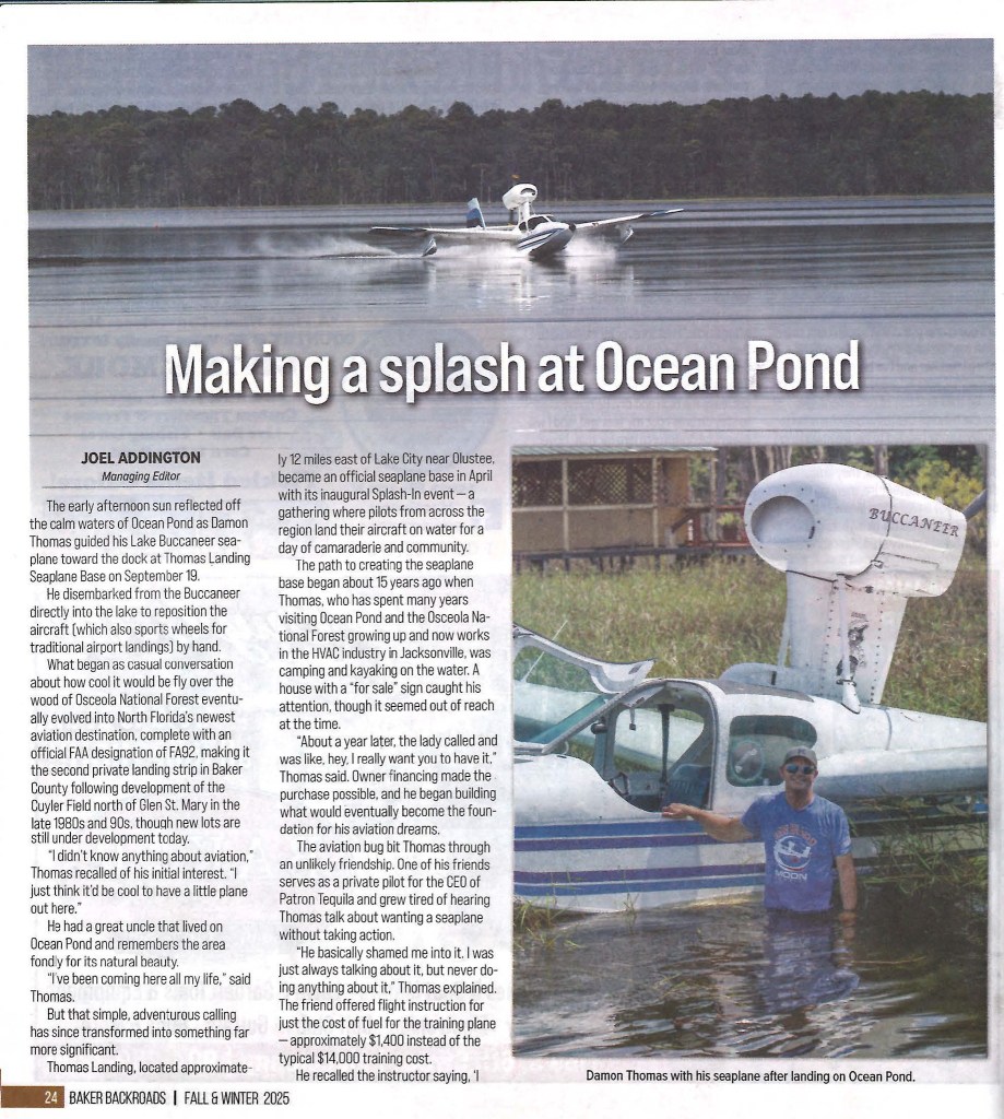 The story, “Making a Splash at Ocean Pond,” shares how this dream became reality. This amazing journey started with Damon’s childhood memories on Ocean Pond and a love of aviation, and turned into the creation of North Florida’s newest FAA-registered seaplane base (FA92) right here in Olustee. We are deeply thankful to the Baker Backroads team for capturing the spirit of what makes this place special… the camaraderie, the natural beauty of the Osceola National Forest, and the thrill of landing a seaplane on our own slice of Florida paradise.
